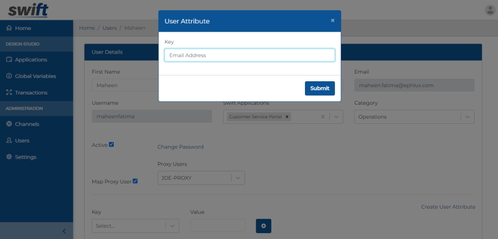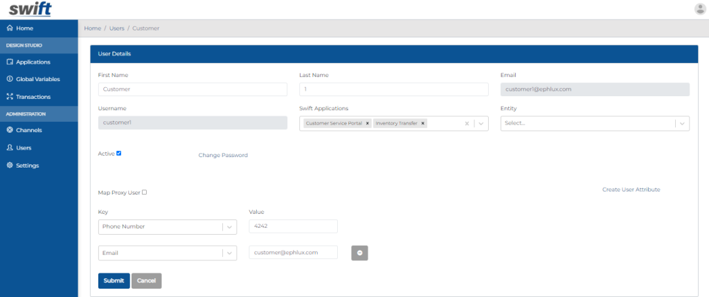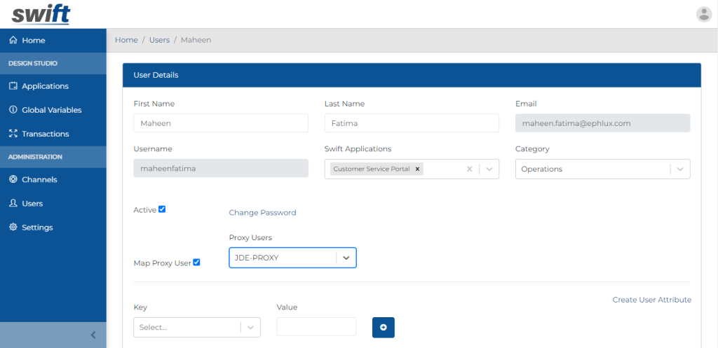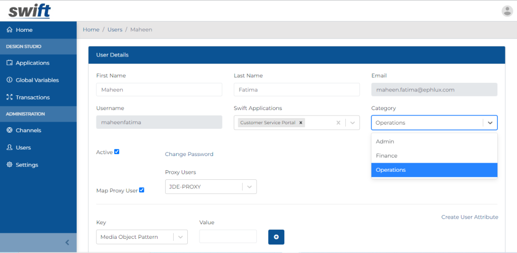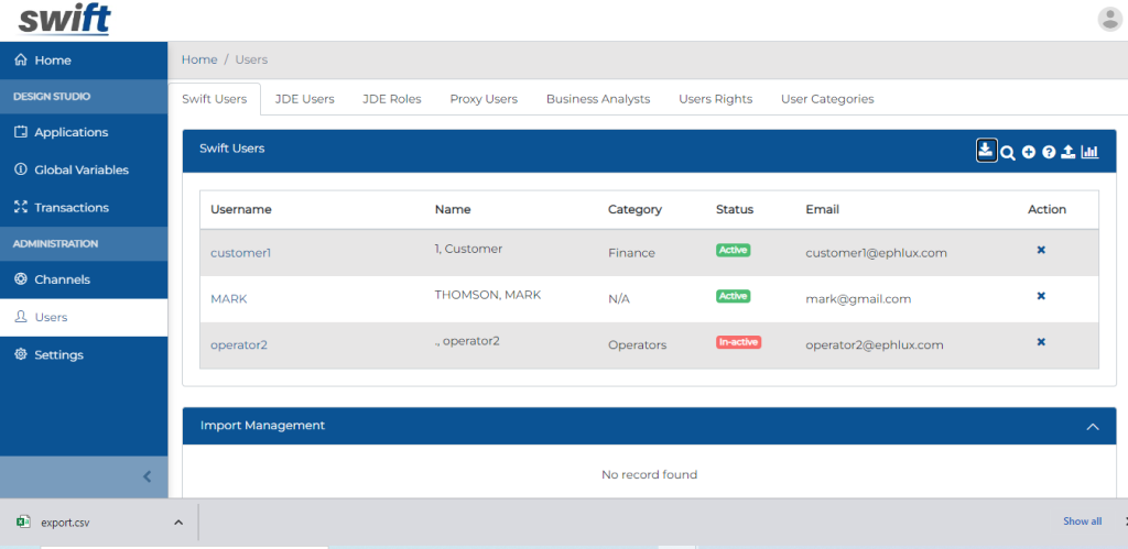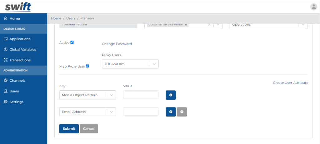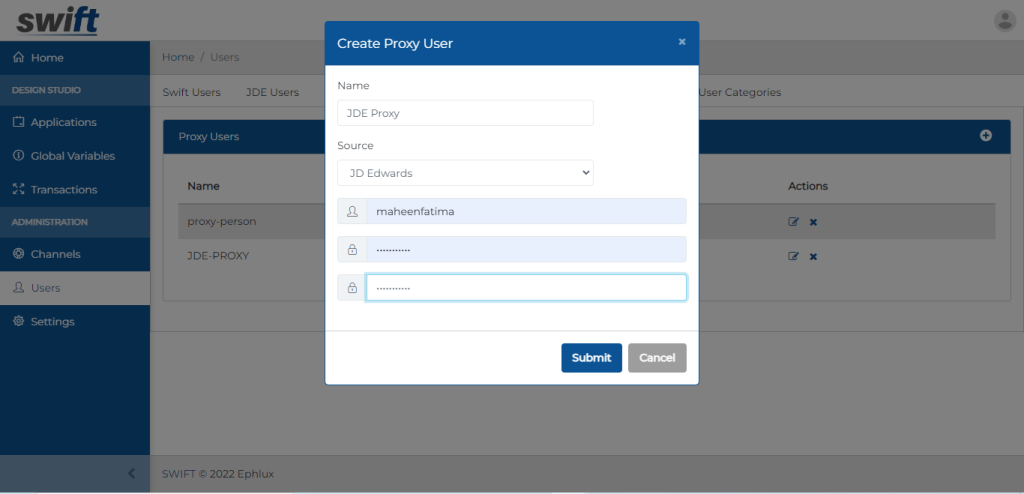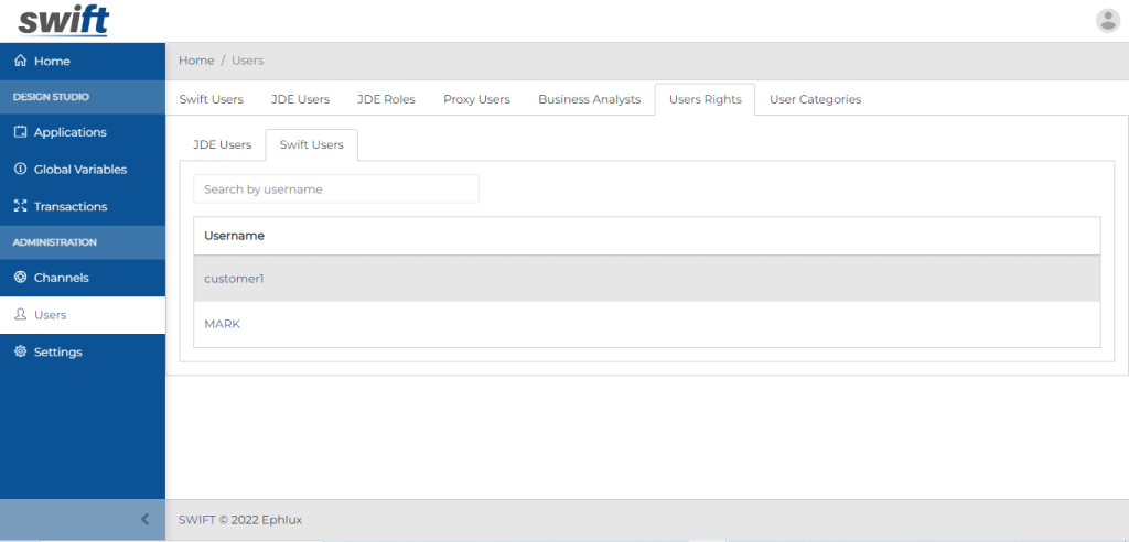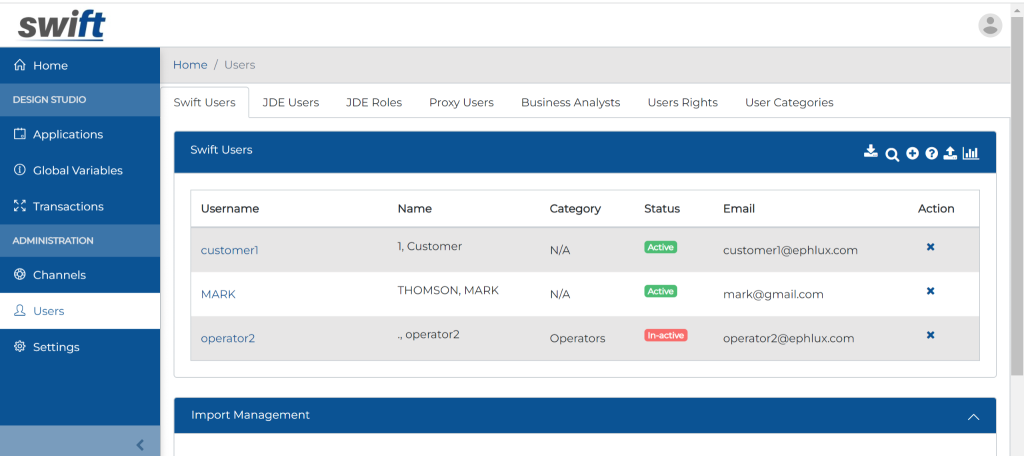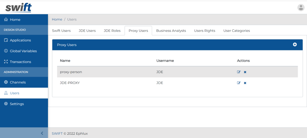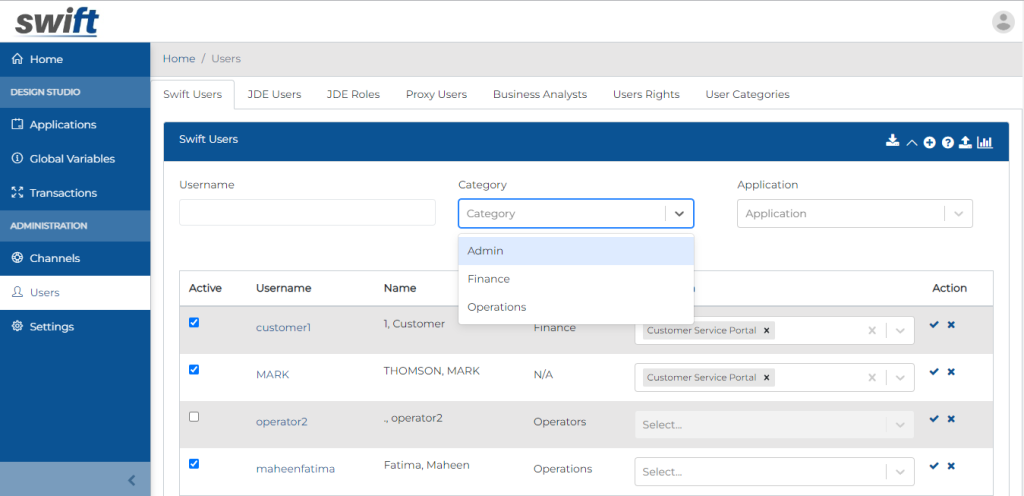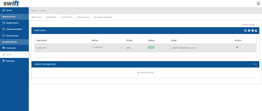 Swift now supports creating non-JDE users (both for internal employees who might not have JDE users) OR for external users such as customers, vendors, partners etc. who don’t have JDE users. Using this feature, Swift apps can now be available to the broader user-base, not limited to those with JDE users only.