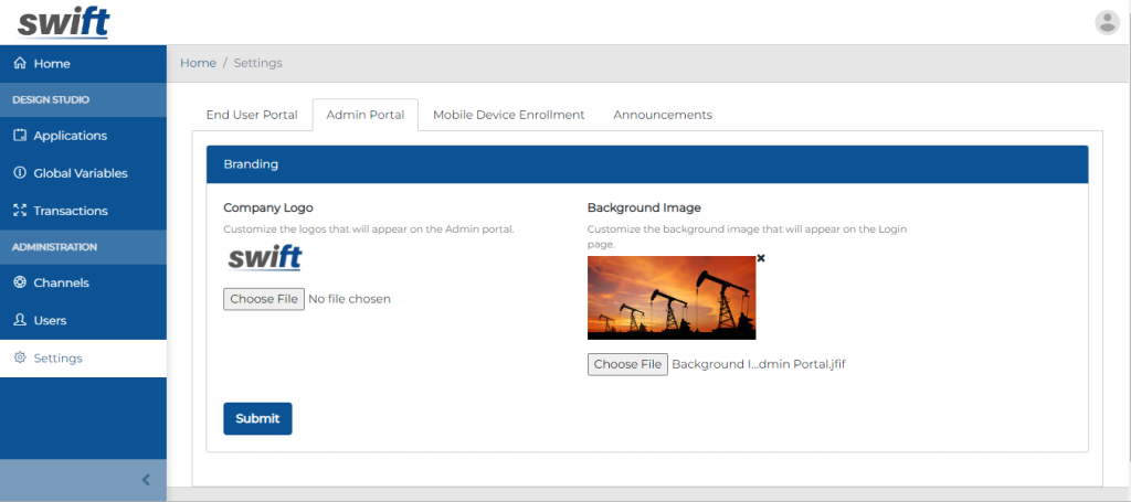 Click on the admin portal tab, and you can customize the company logo and the background image that appears on the admin portal