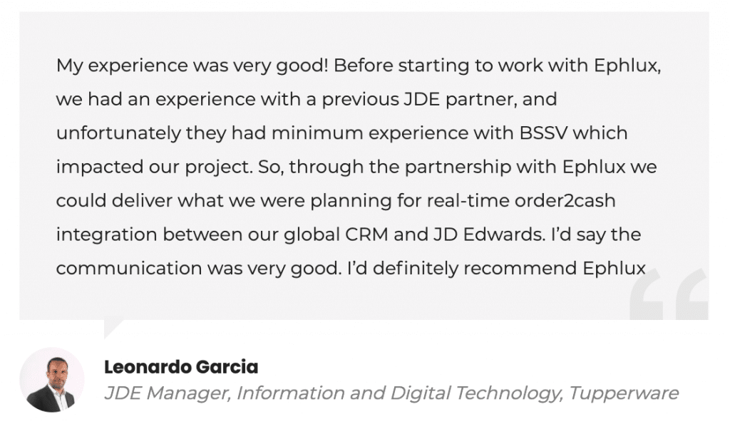Tupperware – an industry leader – relies on Ephlux for global integrations of its complex ‘Order 2 Cash’ Sales processes between their CRM applications and JD Edwards including Shipment Updates, Order Status, Stock Updates, RMA, BOM, Distributor Network Account Reconciliations and more.